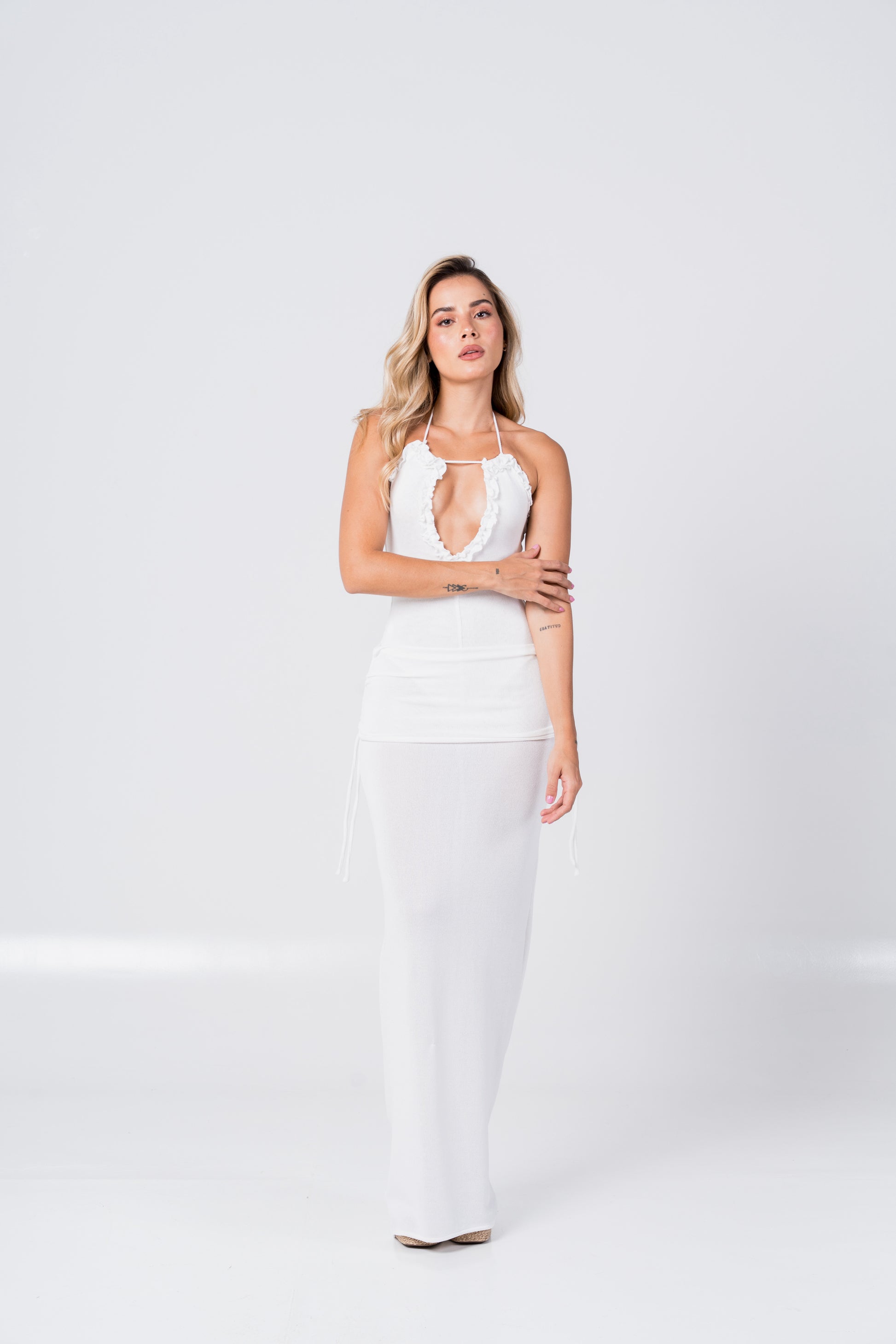 Elaborado en hilo. La modelo usa talla XS, mide 1.70 M.