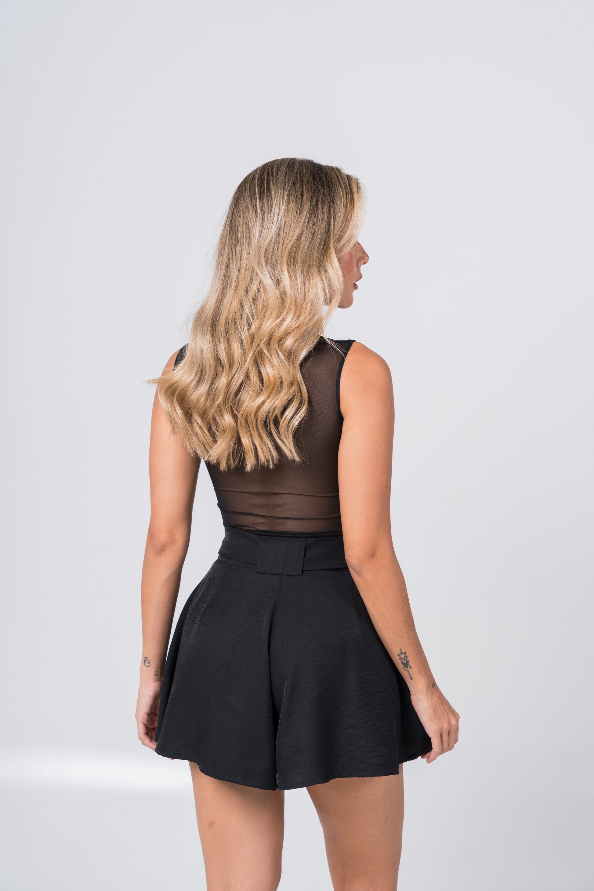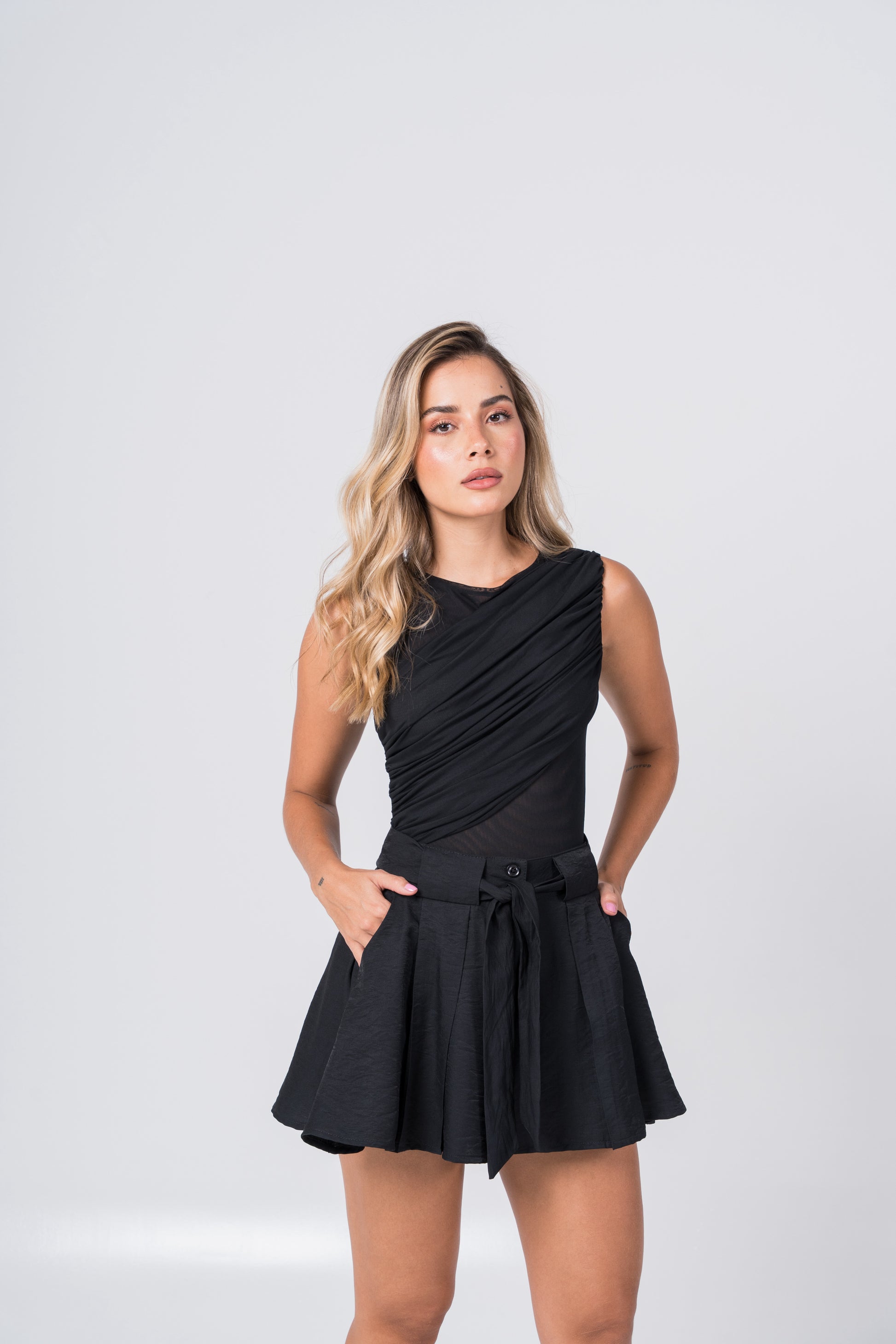 Composición 85% Viscosa 15% Nylon, tela rígida. La modelo usa talla S-8, mide 1.70 M.